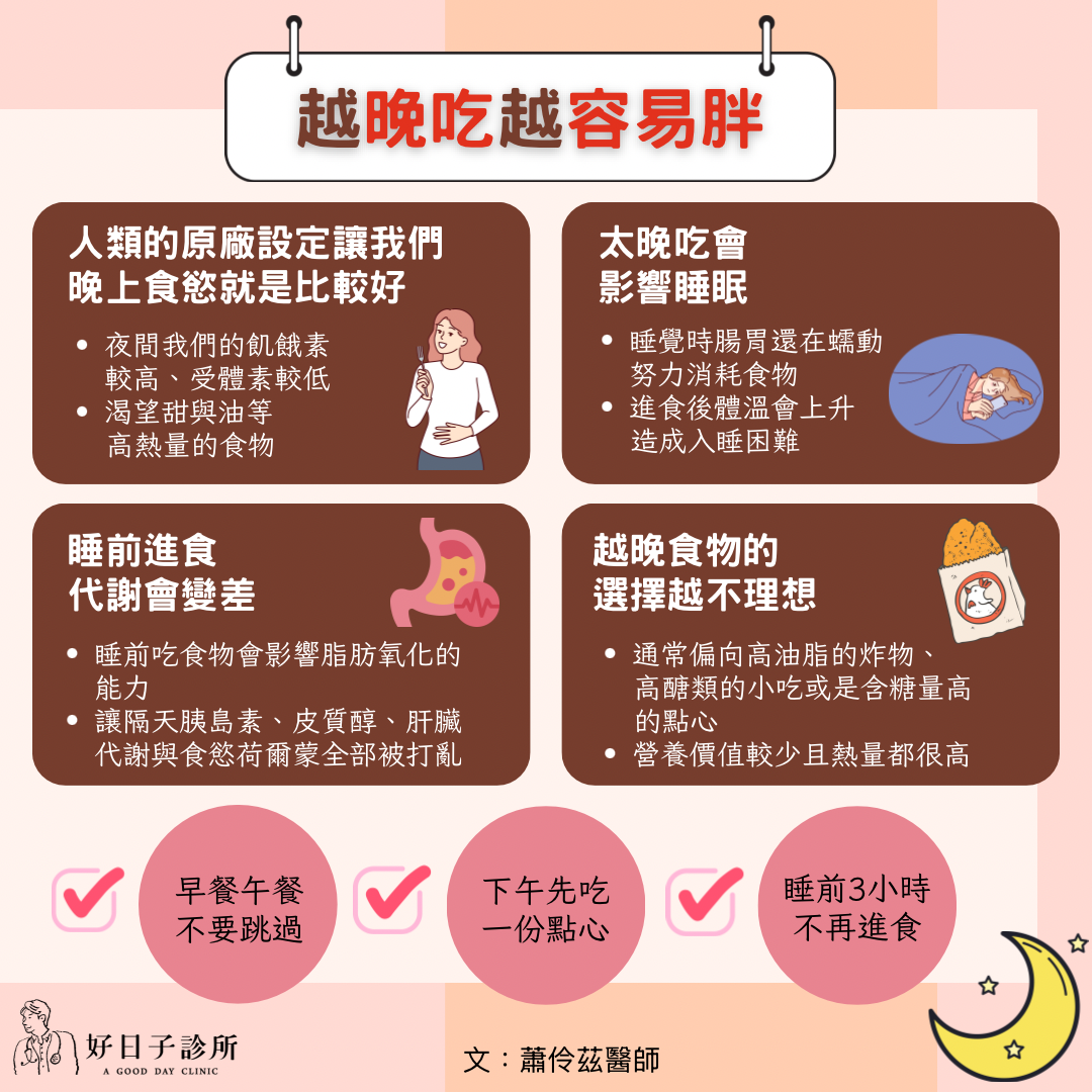 為了避免晚吃影響體重控制,會建議早餐午餐盡量不要跳過,無法好好吃一份餐點,可以喝豆漿或牛奶先補充。如果晚餐會比較晚吃,可以在下午先吃一份點心,像是一份水果、堅果或是地瓜,以避免晚餐時因過度飢餓而暴食的狀況。睡前3小時就不再進食,維持身體正常的機能讓自己順利減重。
