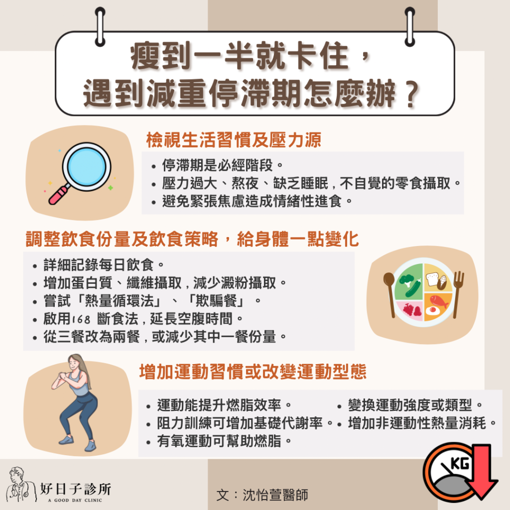 這是許多個案在減重過程中都會遇到的瓶頸,當你體重降低10%左右可能會開始遇到停滯期,這是因為身體逐漸適應現階段的飲食運動方式,與身體代謝率調整及熱量赤字適應有關。