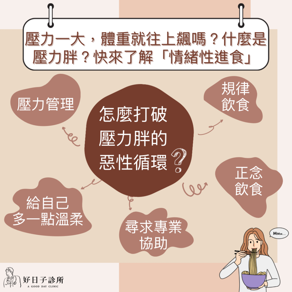 另外,也會使我們的自我控制力下降,想吃炸類、甜點,這就是「情緒性進食」,進一步會導致「壓力胖」!