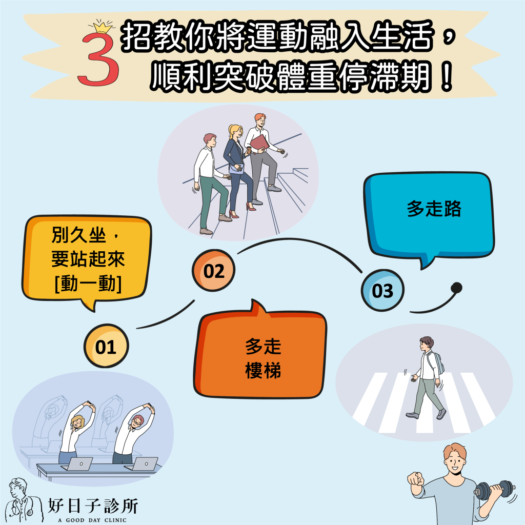 以下三招,把[增加活動]融入在生活中,只要在日常活動中多點活動,就可以讓身體代謝力增加,除了順利突破停滯期,更可以提升免疫力,達到抗衰老的效果!