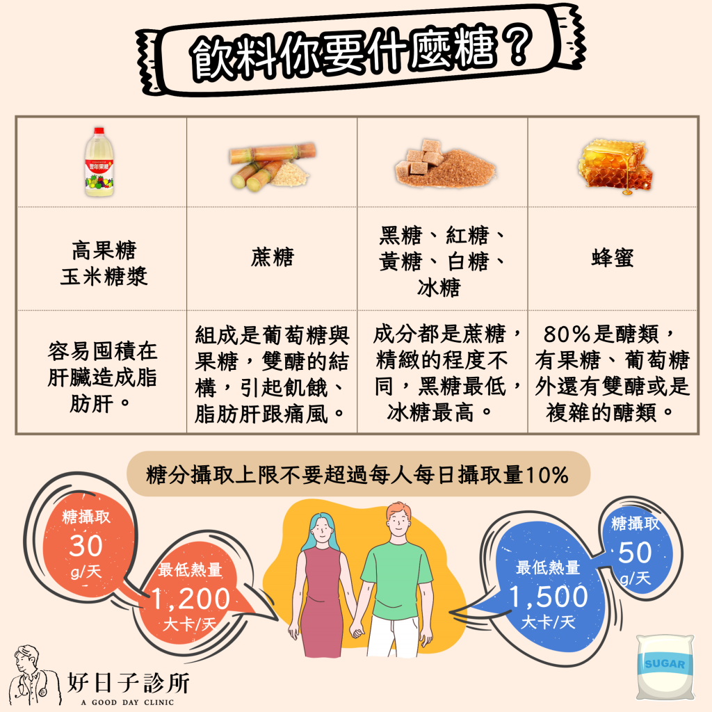 如果食物已經有糖,大約微糖飲料就很容易超過上限,當然能夠越低越健康喔,選無糖還是最佳選擇,才真的能消暑止渴。