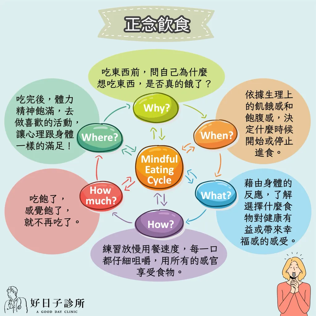 所以正念飲食的意思是透過進食時,專注留意你的心理和生理感受,覺察食物的美味,用心聆聽身體所接受的反饋暗示,讓吃飯成為一種「有意識」的行為,這樣身體的飢餓和飽足感的預備感知可以減緩暴飲暴食的程度,以及避免情緒化的飲食。