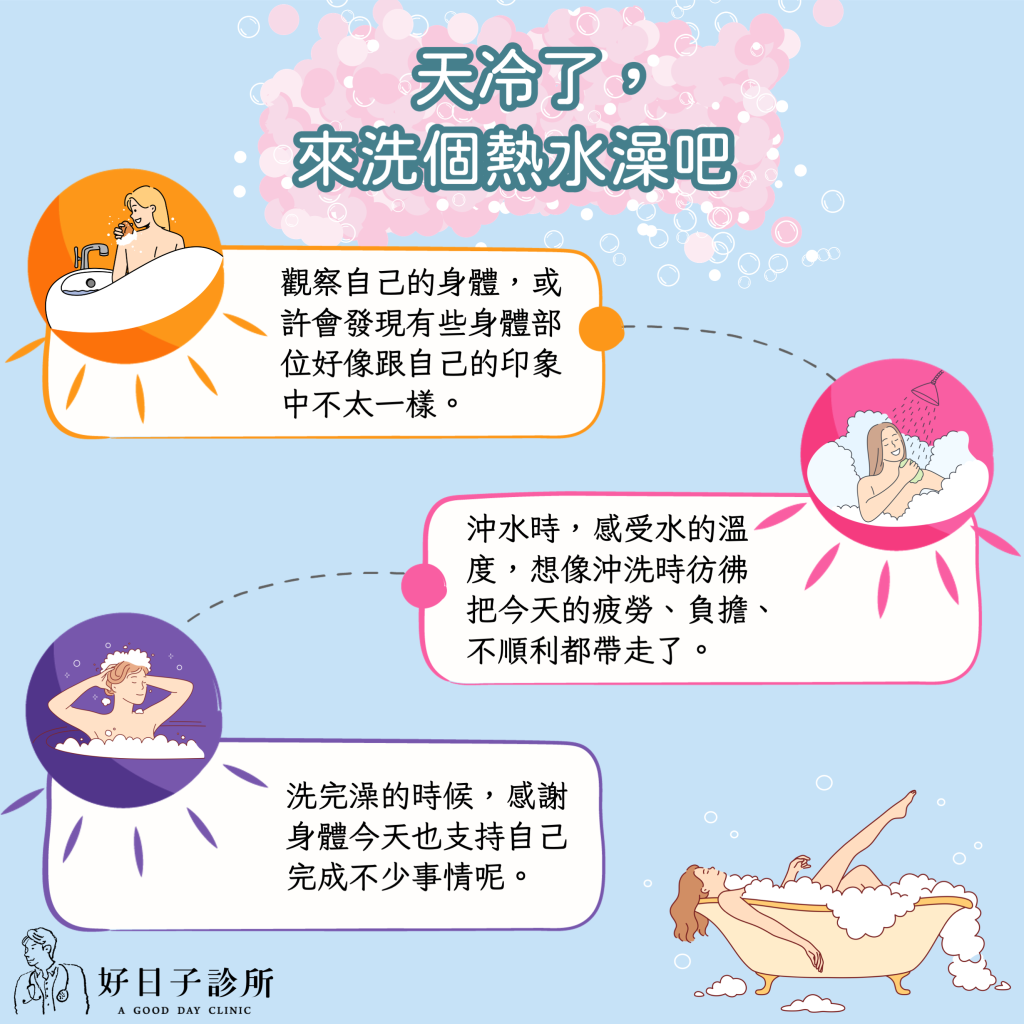 沖水時,感受水的溫度,水噴灑臉上的感覺,水流過身體肌膚的感受,想像沖洗時彷彿把今天的疲勞、負擔、不順利都帶走了。