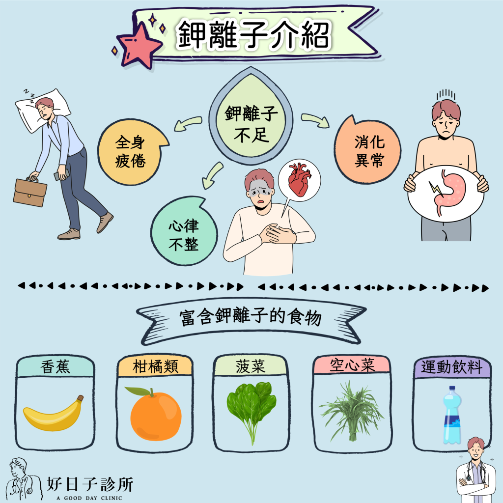 鉀離子的主要功能是維持細胞膜的電位差,所以當鉀離子缺乏時,會讓心臟的收縮力下降、心律不整。