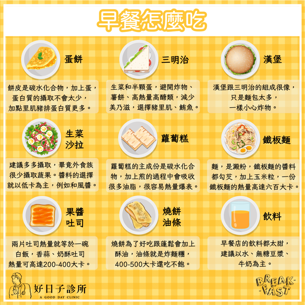 基本上把握幾個大原則:多吃蛋、肉、好的蛋白質,避開澱粉、炸物、高油脂類食物,這樣就可以讓早餐吃得不忌口囉!
