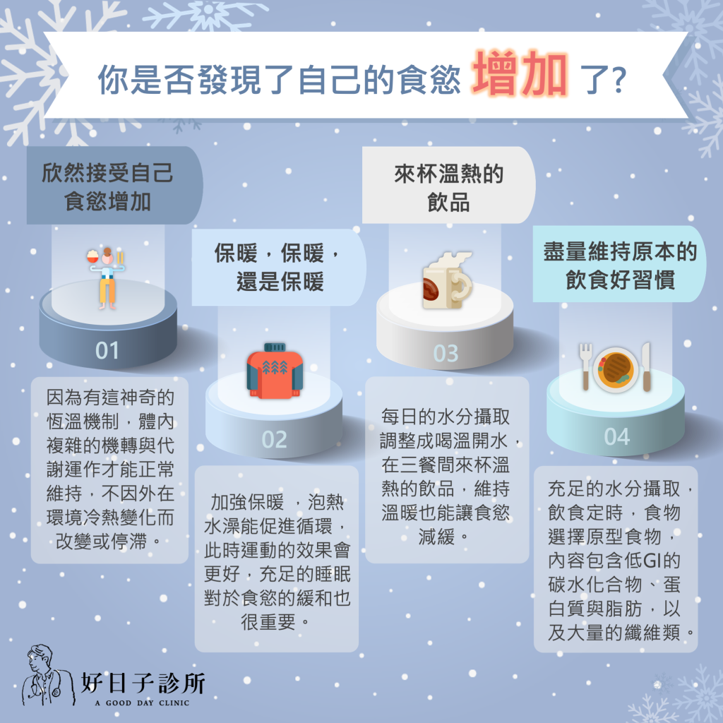 為了適應冬天氣溫的變化,身體需要消耗更多的能量以維持體溫,所以身體會發出增加熱量攝取的訊號,這時候食慾變大是很自然的事情,而在減重的過程中如何適當地應對呢?