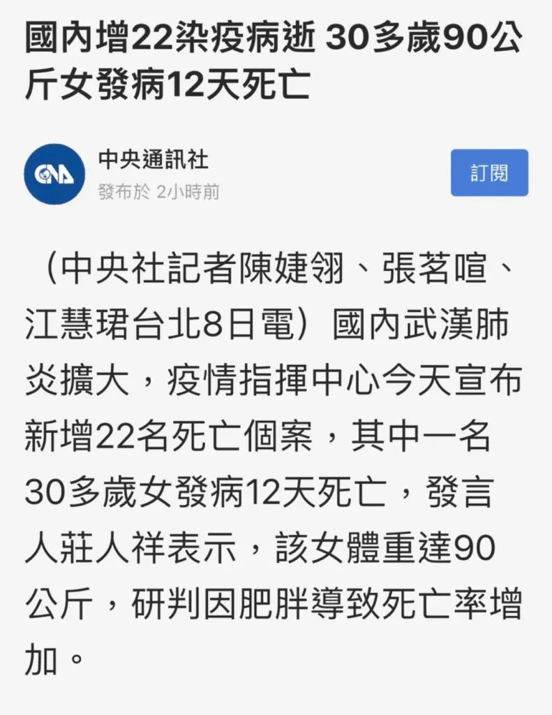 在每天的記者會中,衛福部會公布感染人數與死亡人數,昨天有一個案例很特殊,30多歲女性、無慢性病、發病12天後死亡,特別吸引了我的目光。