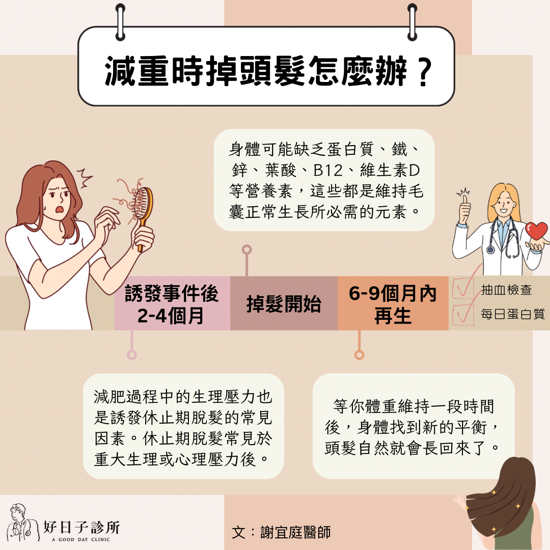 「醫師,我脂肪還沒減少,頭髮已經掉一大把了欸!」減肥會導致掉頭髮,主要原因是因為減重或熱量攝取不足會造成營養缺乏,進而引發「休止期脫髮」。