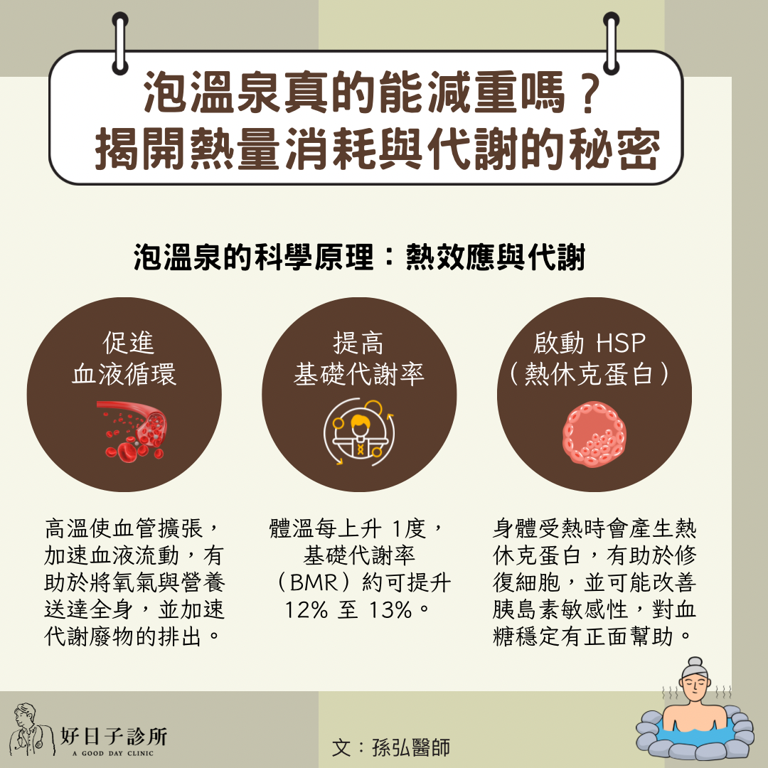 泡溫泉之所以能輔助減重,主要是源於「熱效應」。當身體浸泡在38度至 42度的溫水中時,體溫會隨之升高,進而引發以下生理反應: