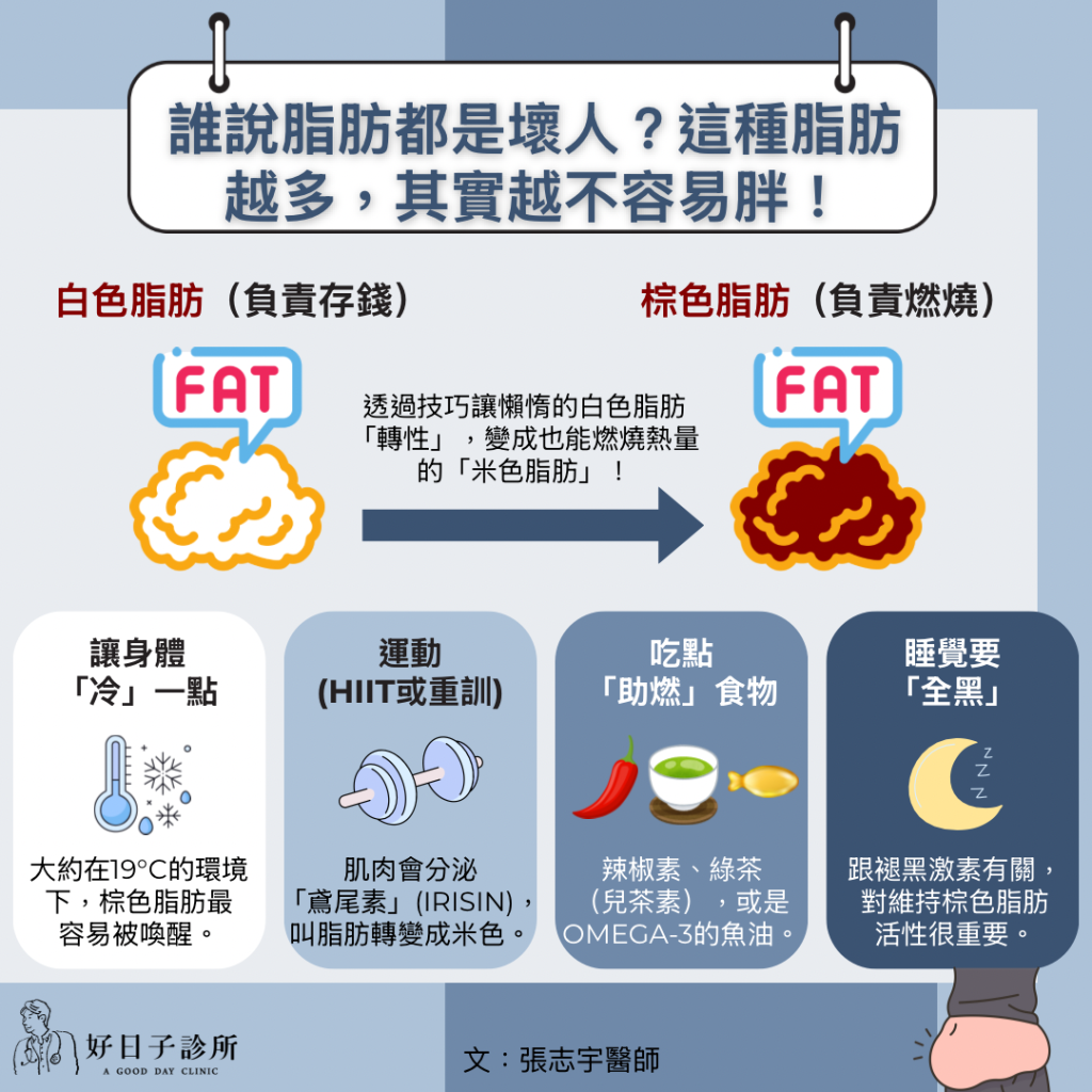 2. 棕色脂肪(負責燒錢): 它是代謝的好幫手!它像體內的火爐,負責「燃燒」脂肪來產熱。
