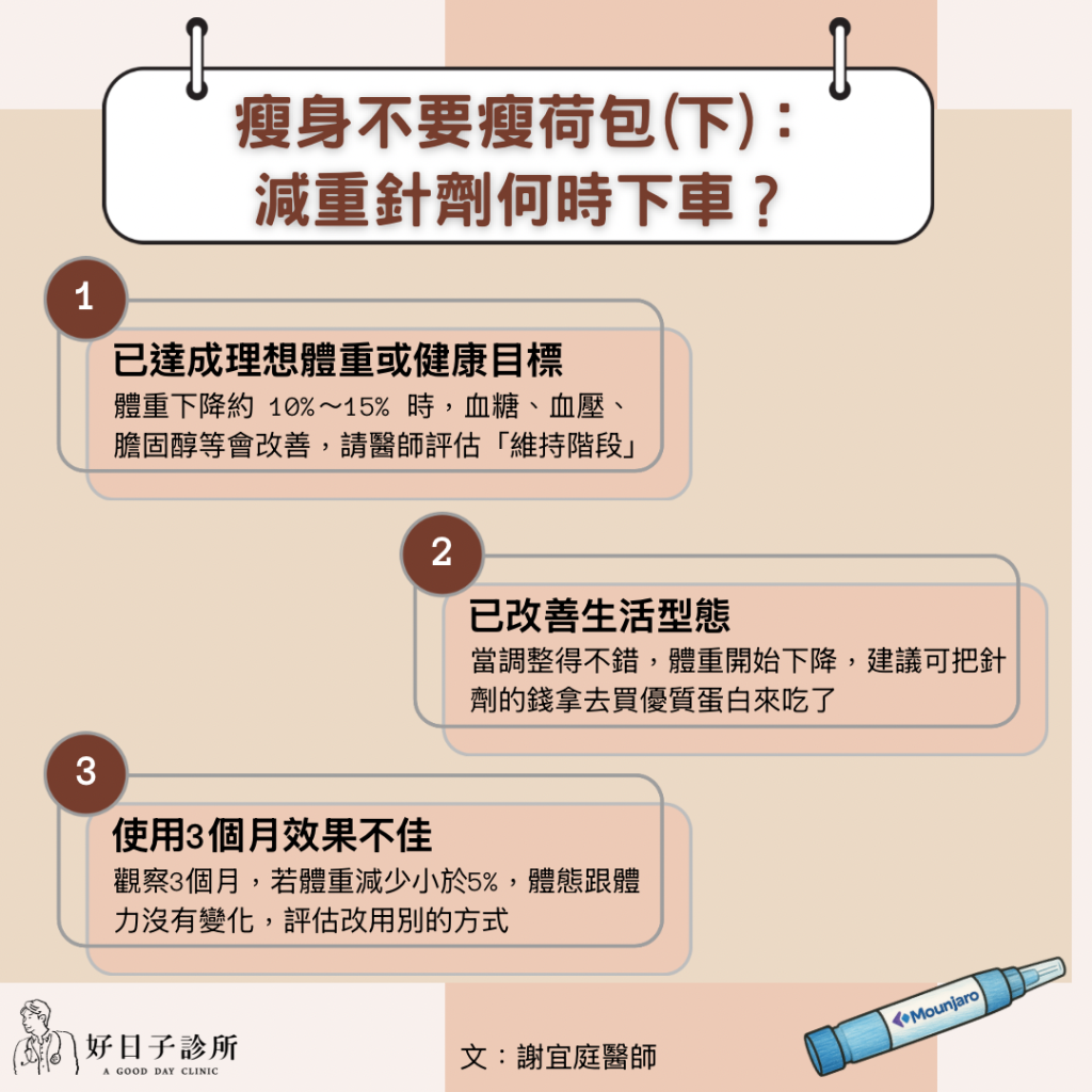 撇除費用問題,以上三點大概就是我們在診間討論停藥的時機。畢竟,減重針劑不是用一輩子的藥,但也不能貿然「跳車」,有系統性地設定減重目標與停用計畫,才能讓花在減重的每一分錢發揮最大價值。