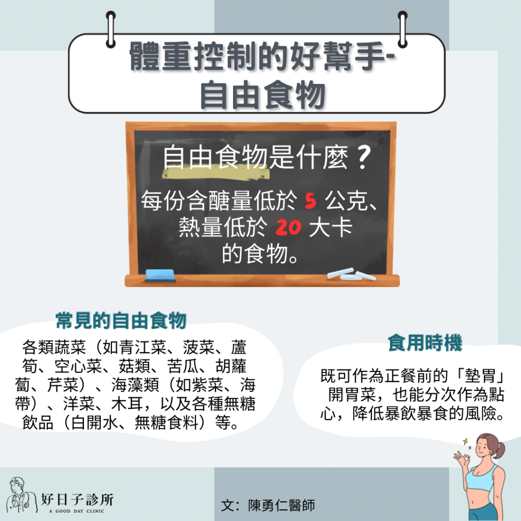 最後,提醒想達到良好體重控制效果的朋友:在選擇自由食物時,仍需注意整體膳食均衡,避免過度依賴調味品或攝取過多鹽分;善用自由食物,不僅能讓你吃得安心、減重不挨餓,更能享受多元且健康的飲食樂趣。