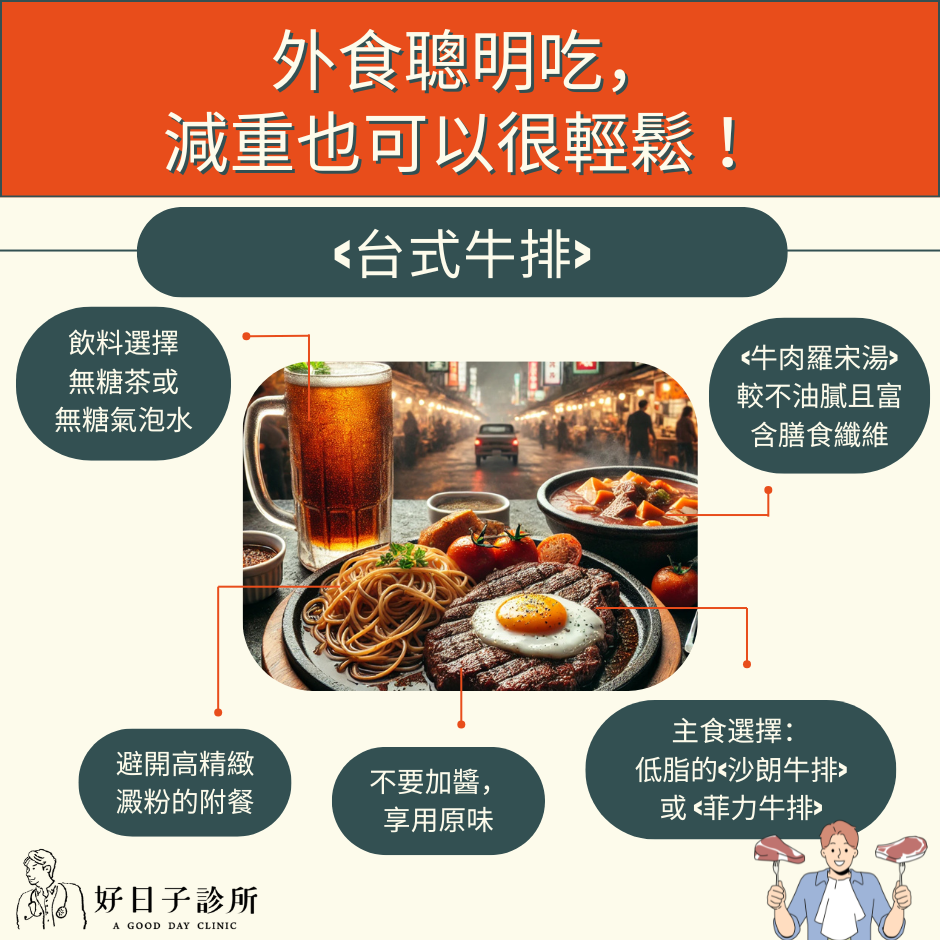 以上分享五點享用<台式牛排>的健康小秘訣,讓你在面對美食時,能更聰明的<選擇>既美味又健康的飲食組合,輕鬆享受減重生活!