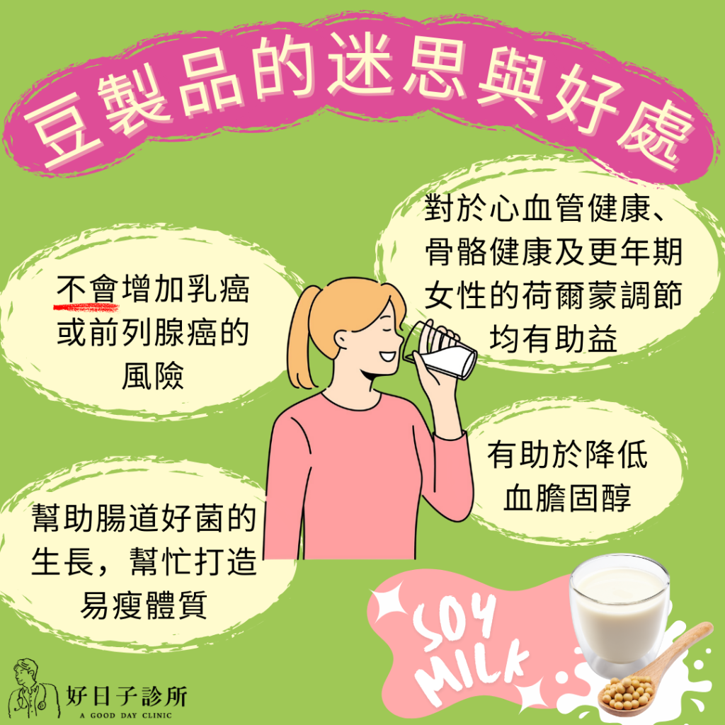 除了不會增加癌症風險外,豆漿還含有豐富的植物性蛋白質、維生素及礦物質,對於心血管健康、骨骼健康及更年期女性的荷爾蒙調節均有助益。