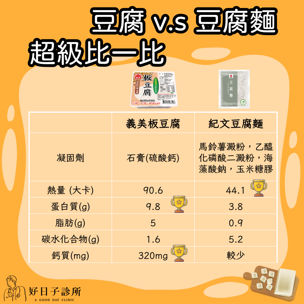 在蛋白質方面,板豆腐的含量為豆腐麵的2.5倍,單就蛋白質攝取量來說,CP值較高!