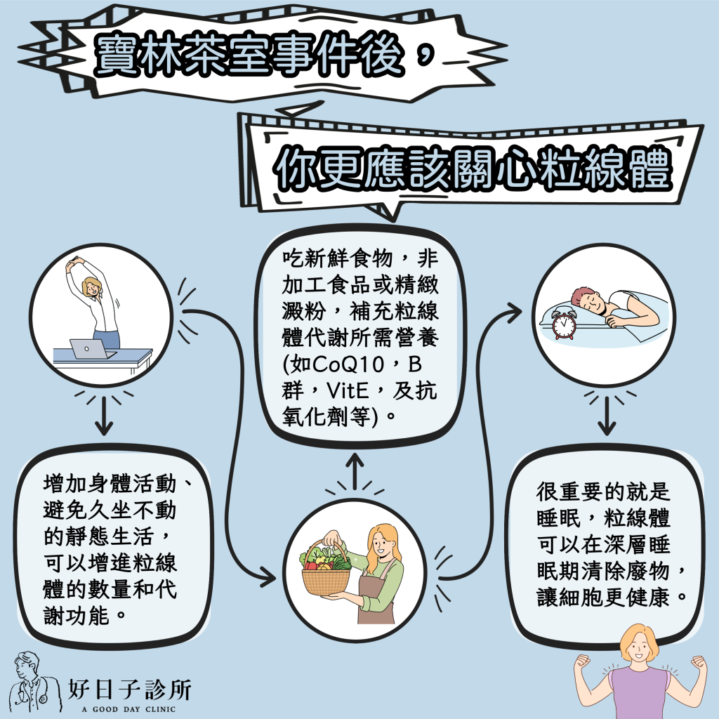 1.增加身體活動、避免久坐不動的靜態生活,這樣可以增進粒線體的數量和代謝功能。
