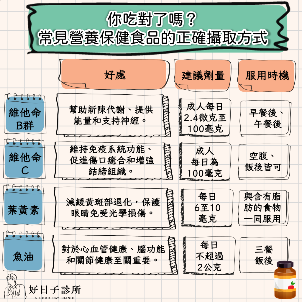 但怎麼吃,與什麼時候吃常是令人疑惑的問題,在本文中,我們簡單的提供維他命B群、C、葉黃素和魚油的每日建議劑量以及最佳服用時機,讓你吃對劑量與時機,以更好地維持身體健康。