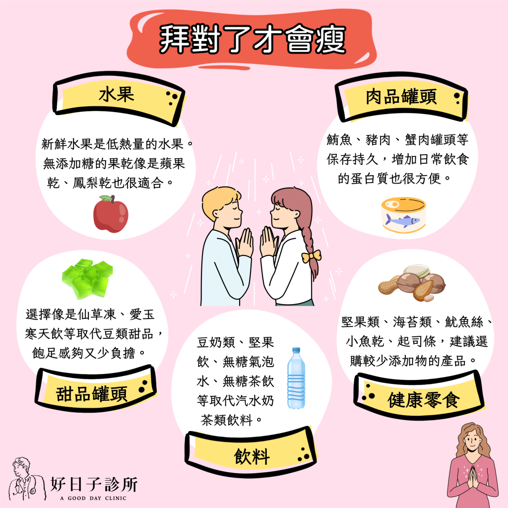 只要帶著真心誠意,拜拜準備的供品些許調整一下,重質不重量就不會為難自己,讓自己避開零食這個減重的大阻礙,讓體重順利下降,身體變健康,神明祖先也歡喜呀。