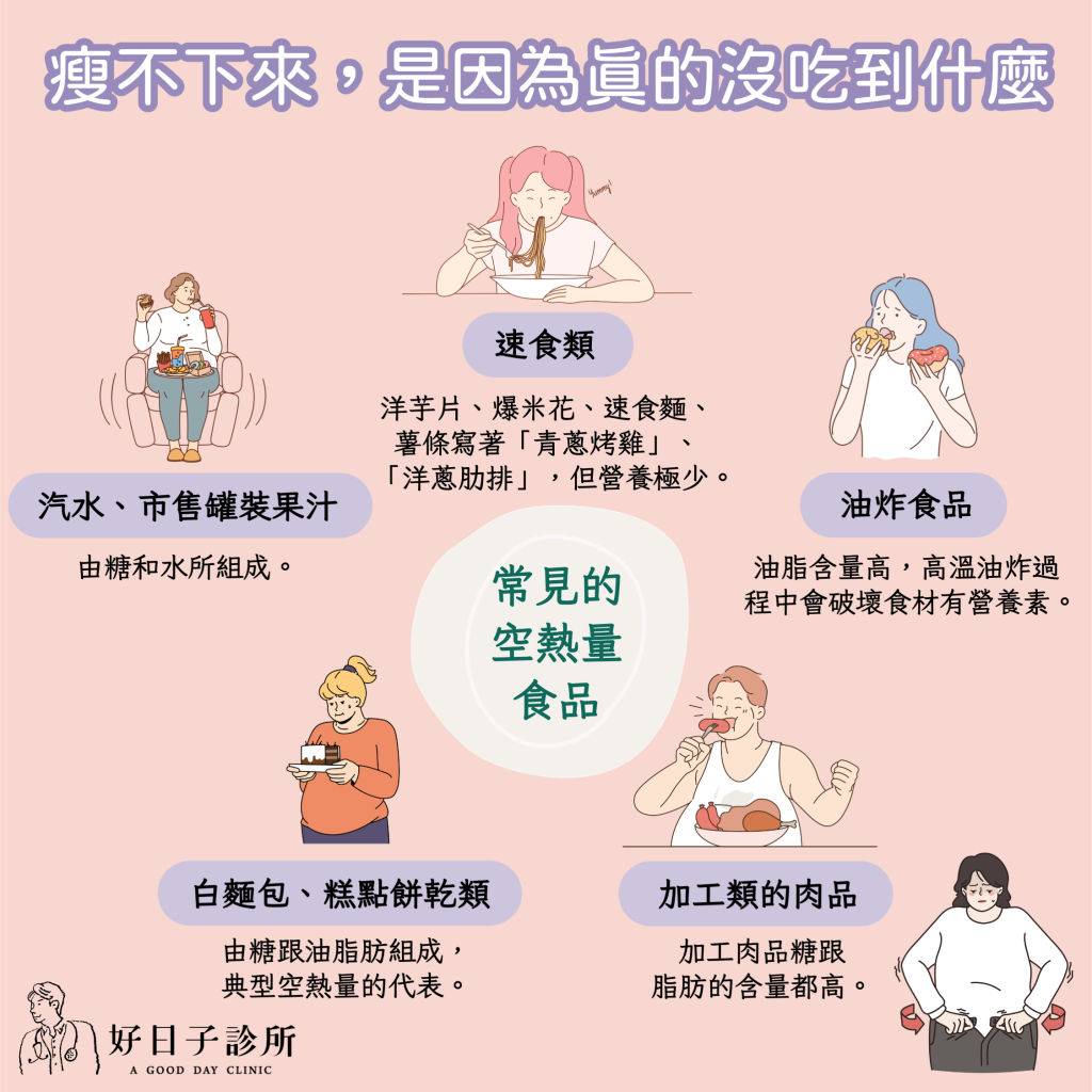 很多瘦不下來的人,詢問一天的飲食內容,才發現真的沒吃到什麼營養,因為大多都是攝取「空熱量」的食物。
