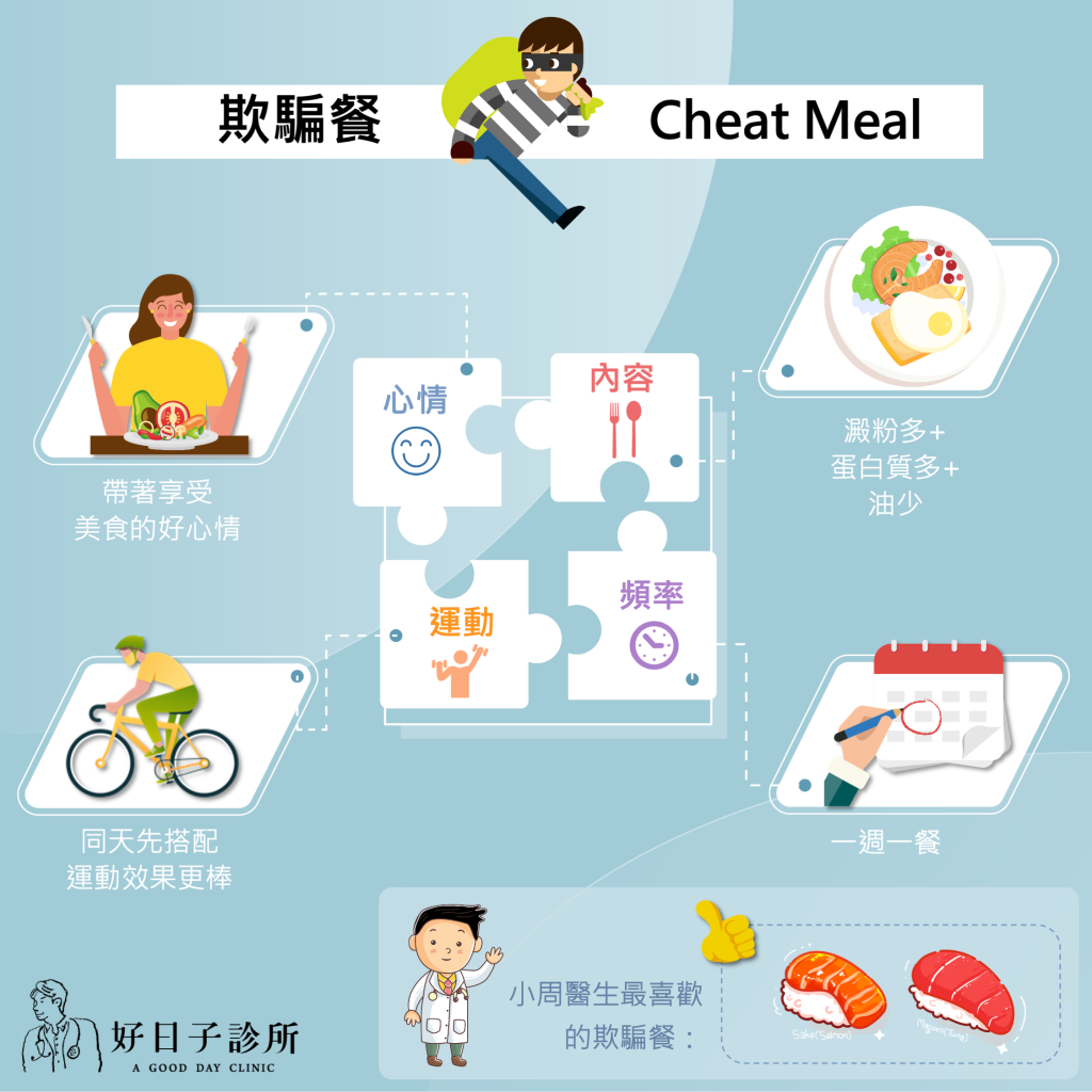 這時候吃一頓大餐反而能刺激身體的代謝齒輪,代謝啟動之後再乖乖恢復飲食控制,反而可以促進體重繼續往下降!這就是「欺騙餐Cheat Meal」的用意。
