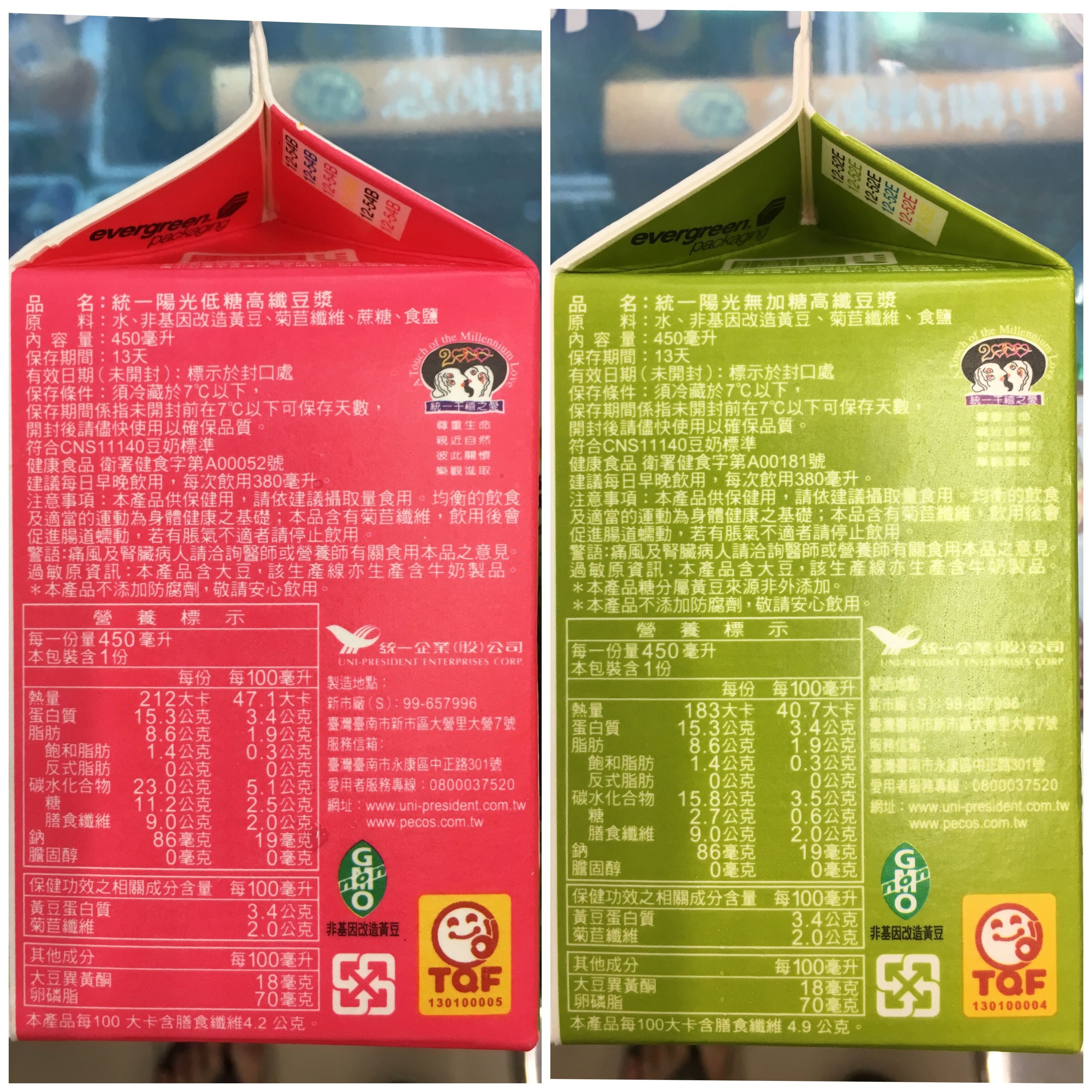 照片中可以看到,低糖豆漿比無糖的多了蔗糖(原料欄),以及多了8.5公克的糖(營養標示欄),所以可以推測低糖豆漿中多添加了8.5公克的蔗糖。