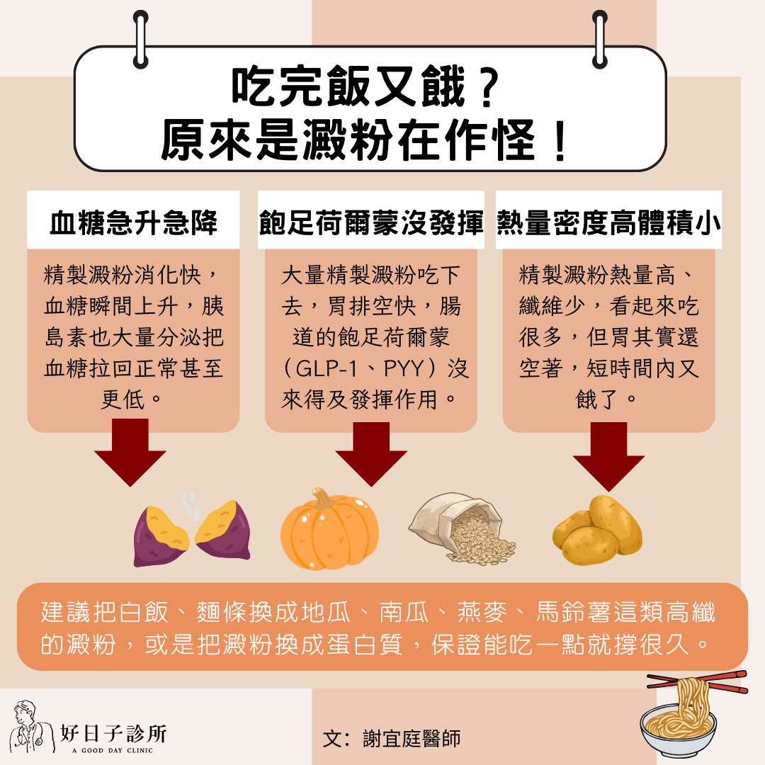 所以下次如果覺得怎麼一下又餓了,建議把白飯、麵條換成地瓜、南瓜、燕麥、馬鈴薯這類高纖的澱粉,或是把澱粉換成蛋白質,保證能吃一點就撐很久。